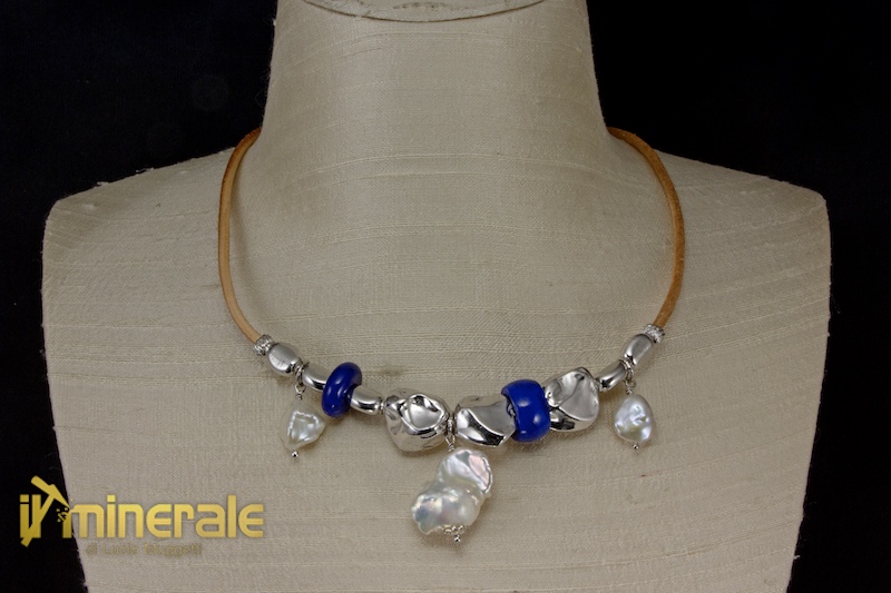 Leather choker with lapis lazuli washers and "fireball" baroque freshwater cultured pearls (the central one measures 15x23.5 mm)