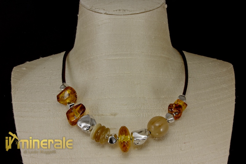 Leather choker with natural amber elements (the central washer has a diameter of 22 mm) and buffalo horn spheres and washers