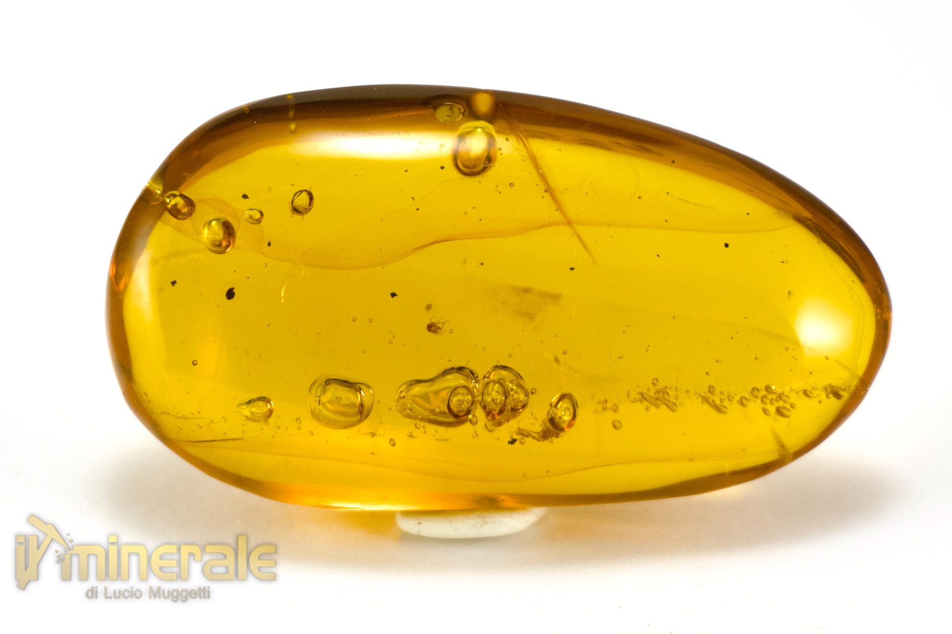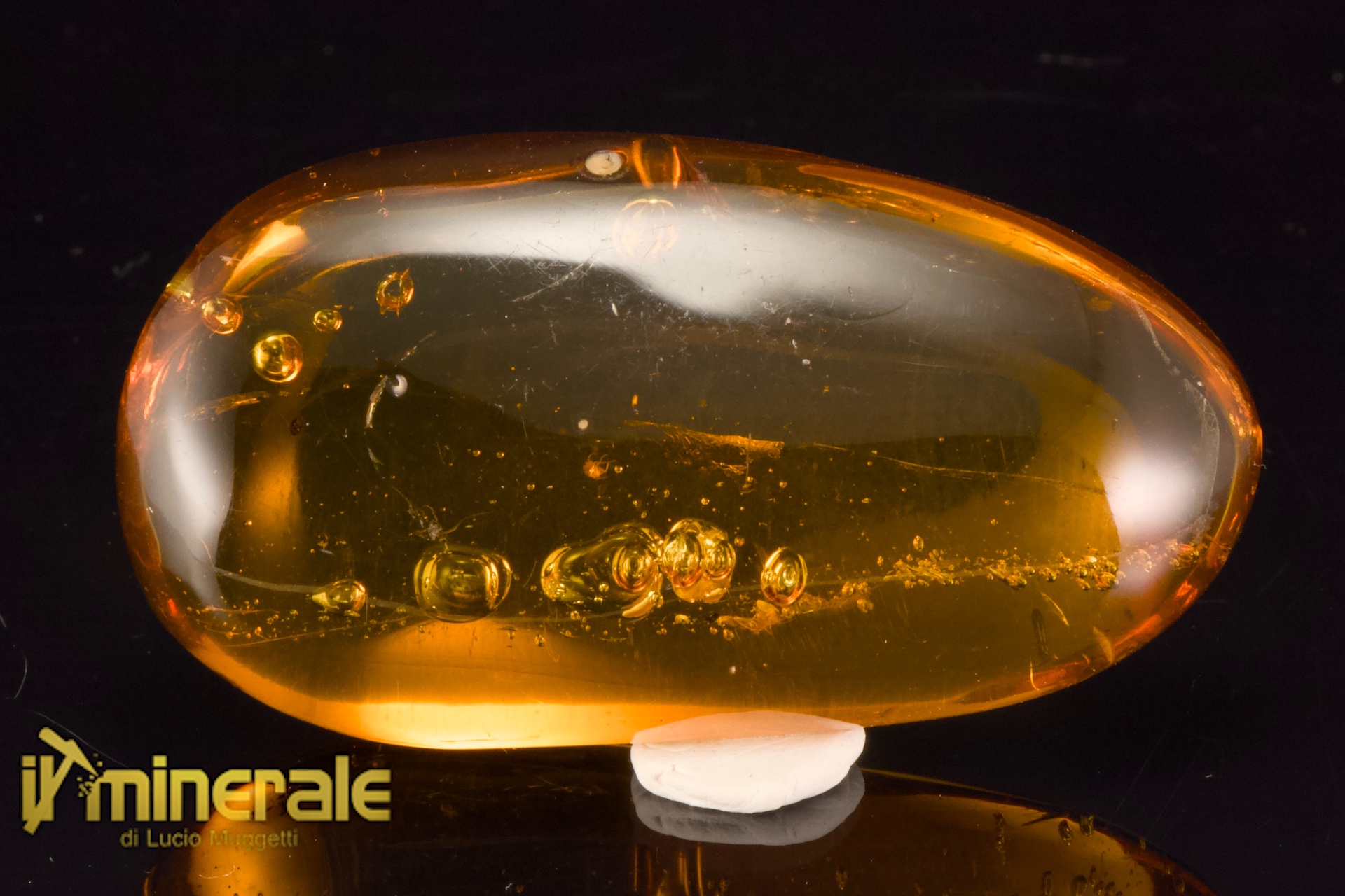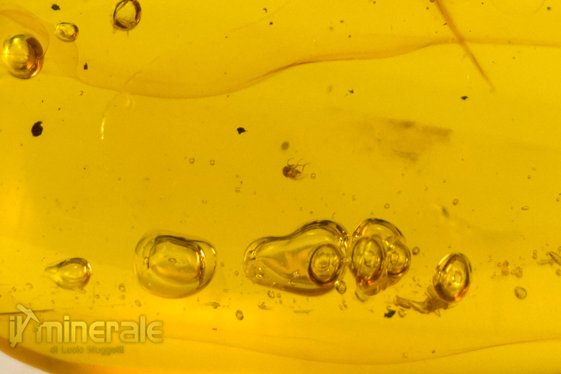 Il campione presenta molte bolle contenenti acqua fossile e due piccoli ditteri molto ben conservati