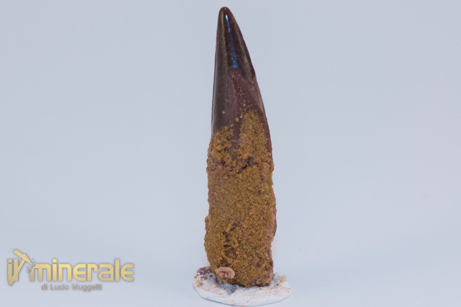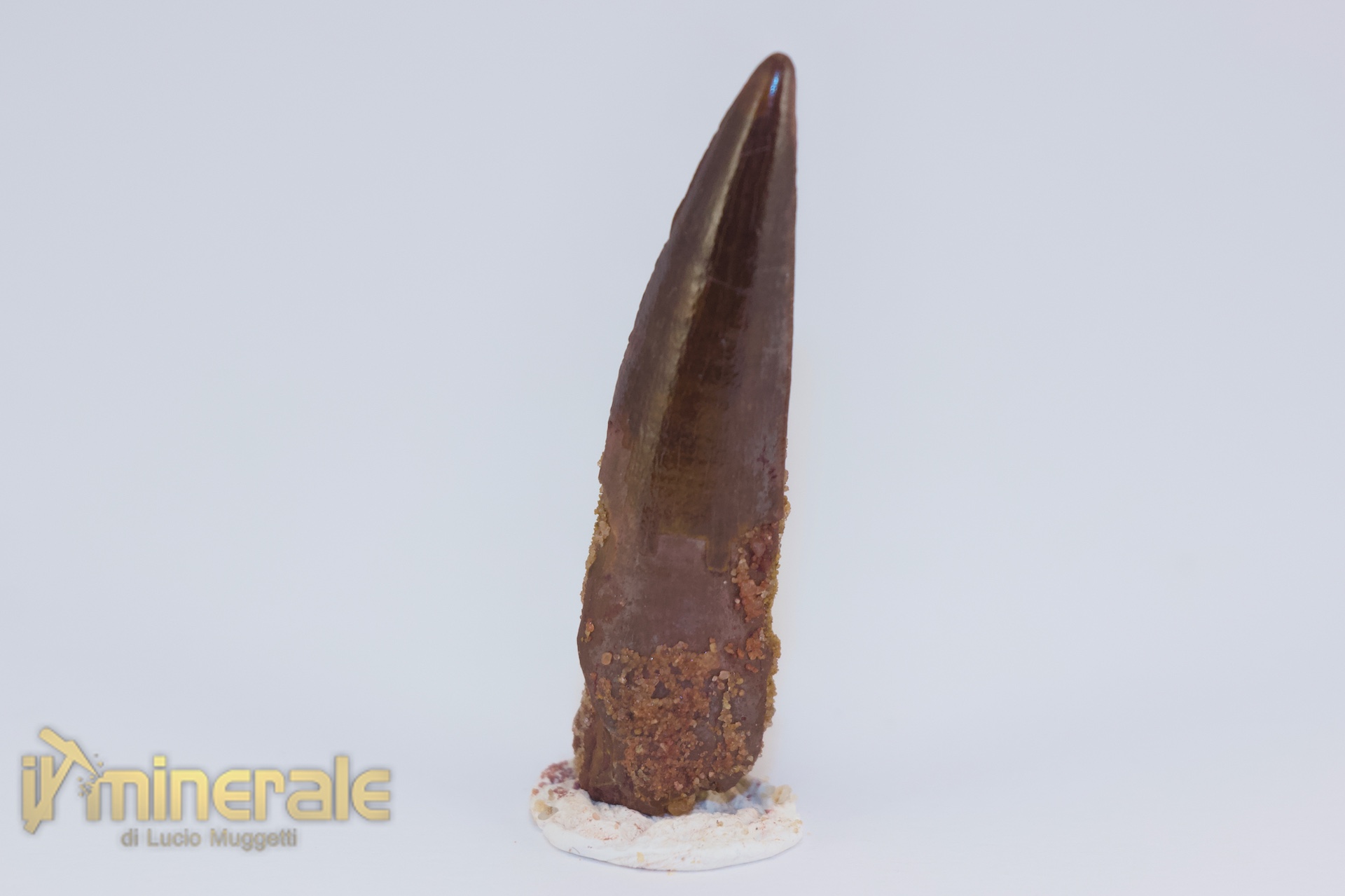 Dente fossile senza matrice di "Spinosaurus aegyptiacus" (gigantesco dinosauro carnivoro teropode). Il dente è integro e di qualità extra