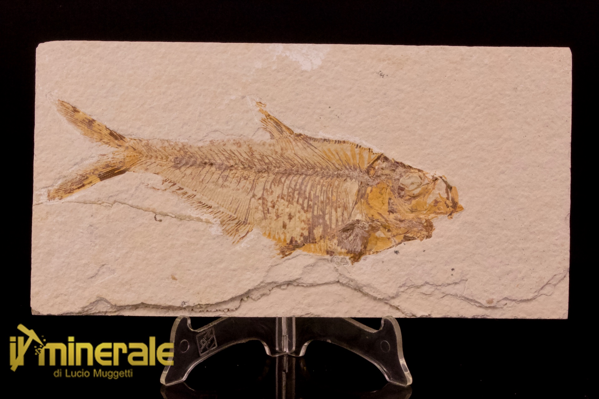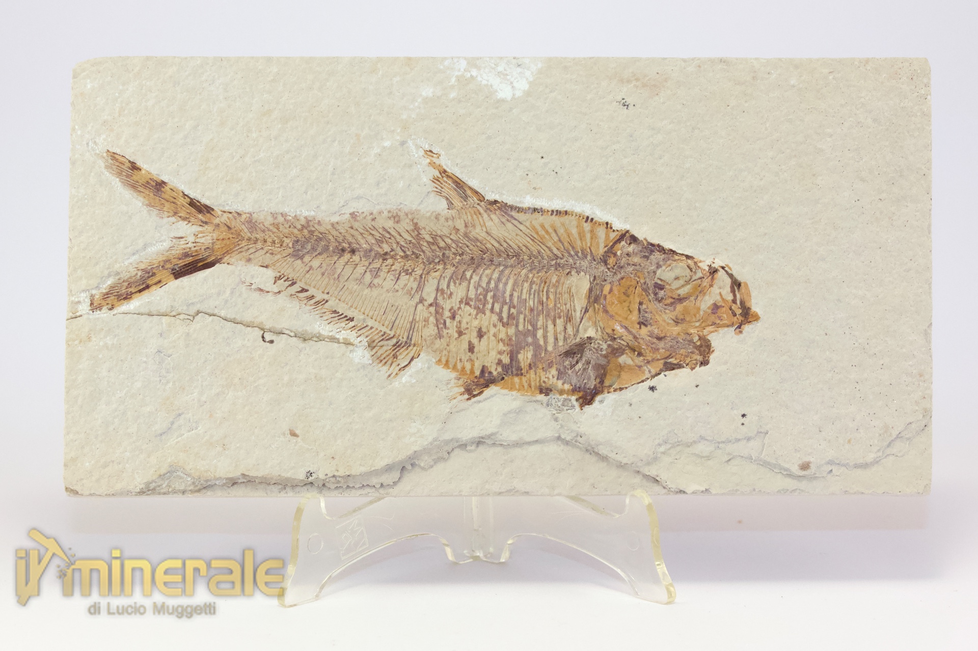 Pesce fossile "Diplomistus dentatus"; lo strato superficiale della lastra è riparato in due parti.