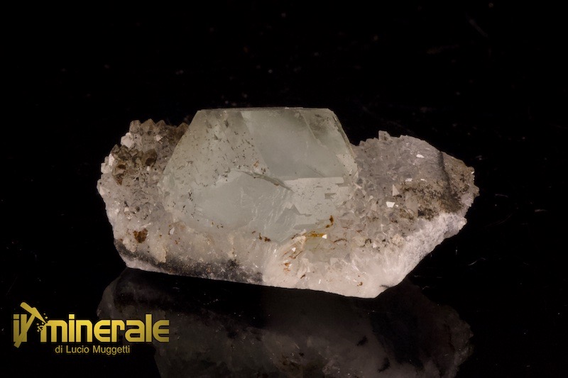 Cristallo isolato di fluorite semitrasparente di colre verde chiaro (2,1x1,8 cm) in associazione con cristalli millimetrici di quarzo ialino