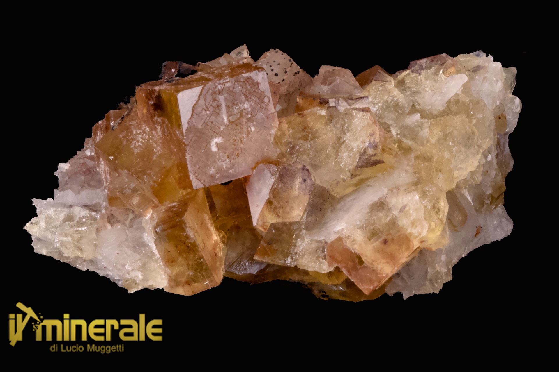 Fluorite gialla in cristalli centimetrici cubici fittamente compenetrati (Massimo 1,2 cm) con forte fluorescemnza viola
