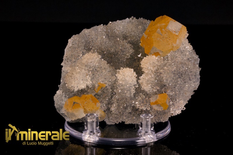 Fluorite in cristalli centimetrici (massimo 2,15 cm) cubici fittamente compenetrati, semitrasparenti di colore verde chiaro e parzialmente rivestiti da ossidi di ferro in associazione con fitti cristalli millimetrici di quarzo ialino