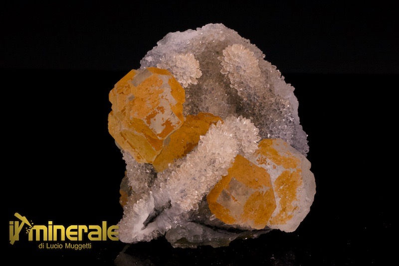 Fluorite in cristalli centimetrici (massimo 2,4 cm) cubici fittamente compenetrati, semitrasparenti di colore verde chiaro e parzialmente rivestiti da ossidi di ferro in associazione con fitti cristalli millimetrici di quarzo ialino
