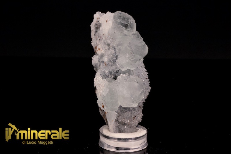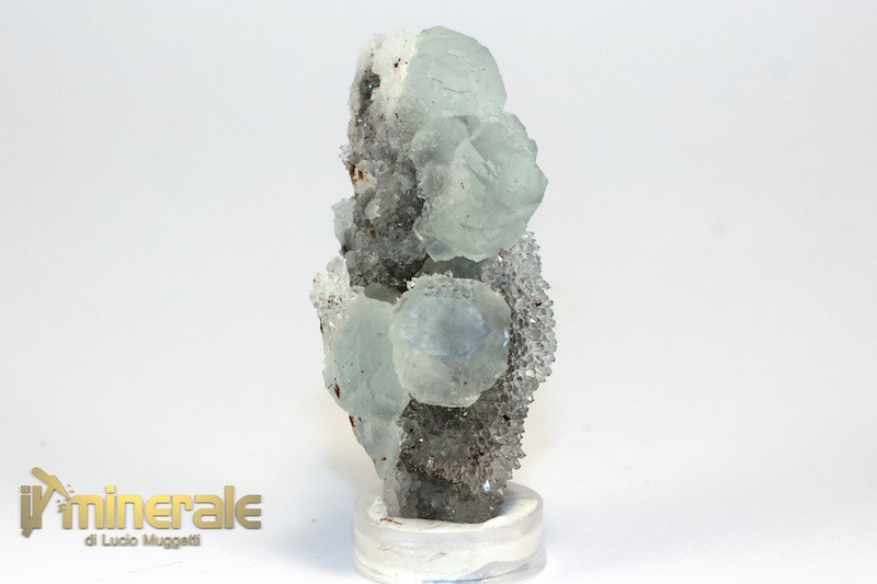 Fluorite in cristalli centimetrici (massimo 1,6 cm) cubici fittamente compenetrati, semitrasparenti di colore verde chiaro ed in associazione con fitti cristalli millimetrici di quarzo ialino