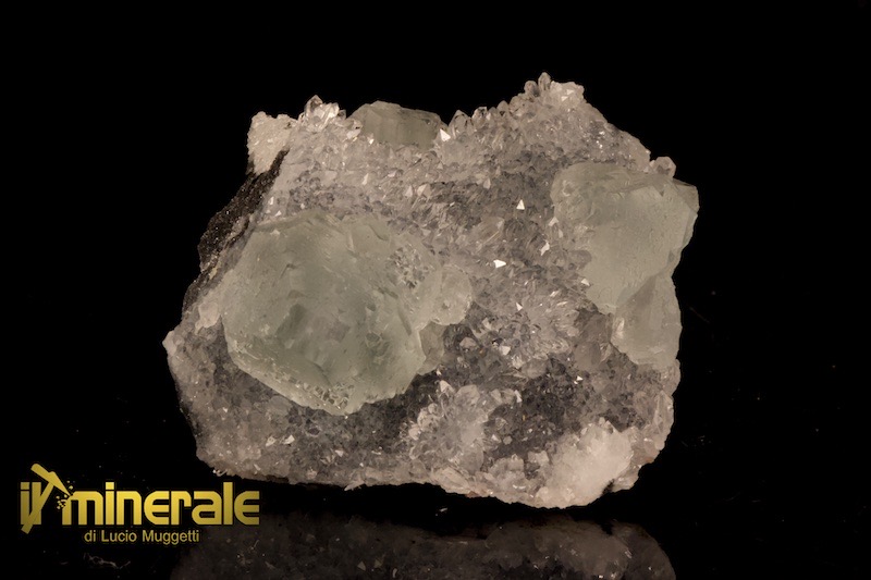 Fluorite in cristalli centimetrici (massimo 1,8 cm) cubici fittamente compenetrati, semitrasparenti di colore verde chiaro ed in associazione con fitti cristalli millimetrici di quarzo ialino