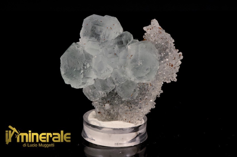 Fluorite in cristalli centimetrici (massimo 1,7 cm) cubici fittamente compenetrati, semitrasparenti di colore verde chiaro ed in associazione con fitti cristalli millimetrici di quarzo ialino