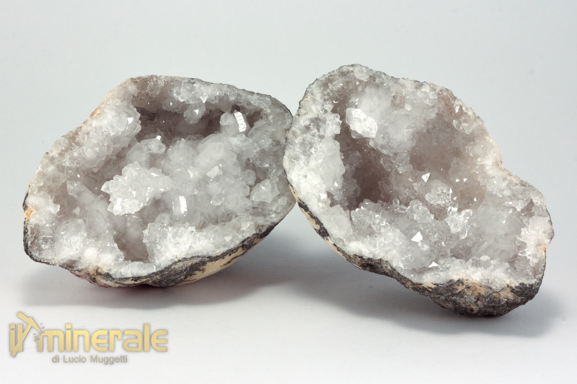 Geode intero con piccoli cristalli di calcite bianca da trasparente a traslucida e cristalli più grandi di quarzo ialino e latteo
