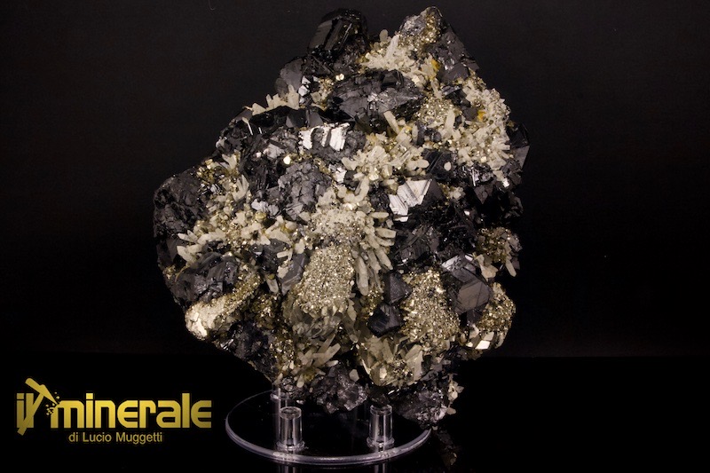 Sfalerite o blenda varietà "marmatite" in grandi cristalli centimetrici neri con accentuata lucentezza metallica associati a numerosi cristalli di quarzo latteo e piccoli cristalli di arsenopirite