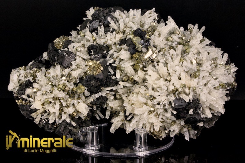 Sfalerite o blenda varietà "marmatite" in grandi cristalli centimetrici neri con accentuata lucentezza metallica associati a numerosi cristalli di quarzo latteo e piccoli cristalli di arsenopirite
