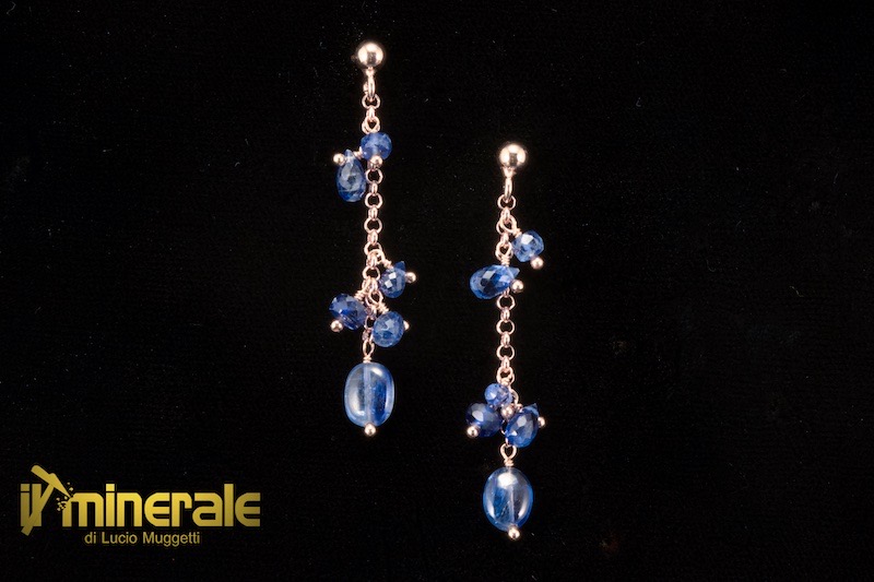 Orecchini pendenti in argento 925 placcato oro rosa con lenti (6x8 mm), sfere e gocce sfaccettate di cianite semi-trasparente