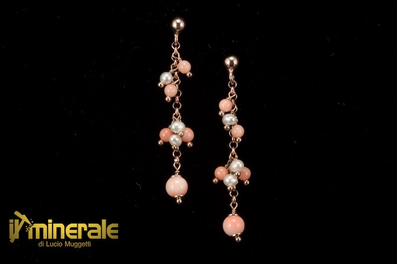 Orecchini pendenti in argento 925 placcato oro rosa con sfere (diametro 5,5 e 3,5 mm) di corallo rosa e piccole perle coltivate d'acqua dolce