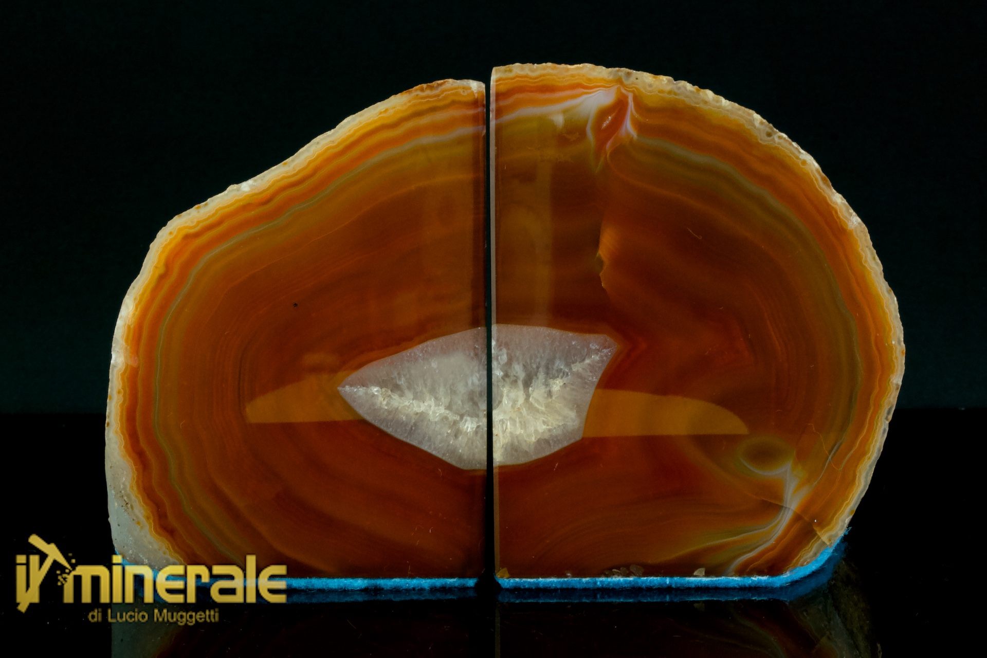 Nodulo di agata-corniola e quarzo ialino compatto tagliato e lucidato in due parti a reggilibri