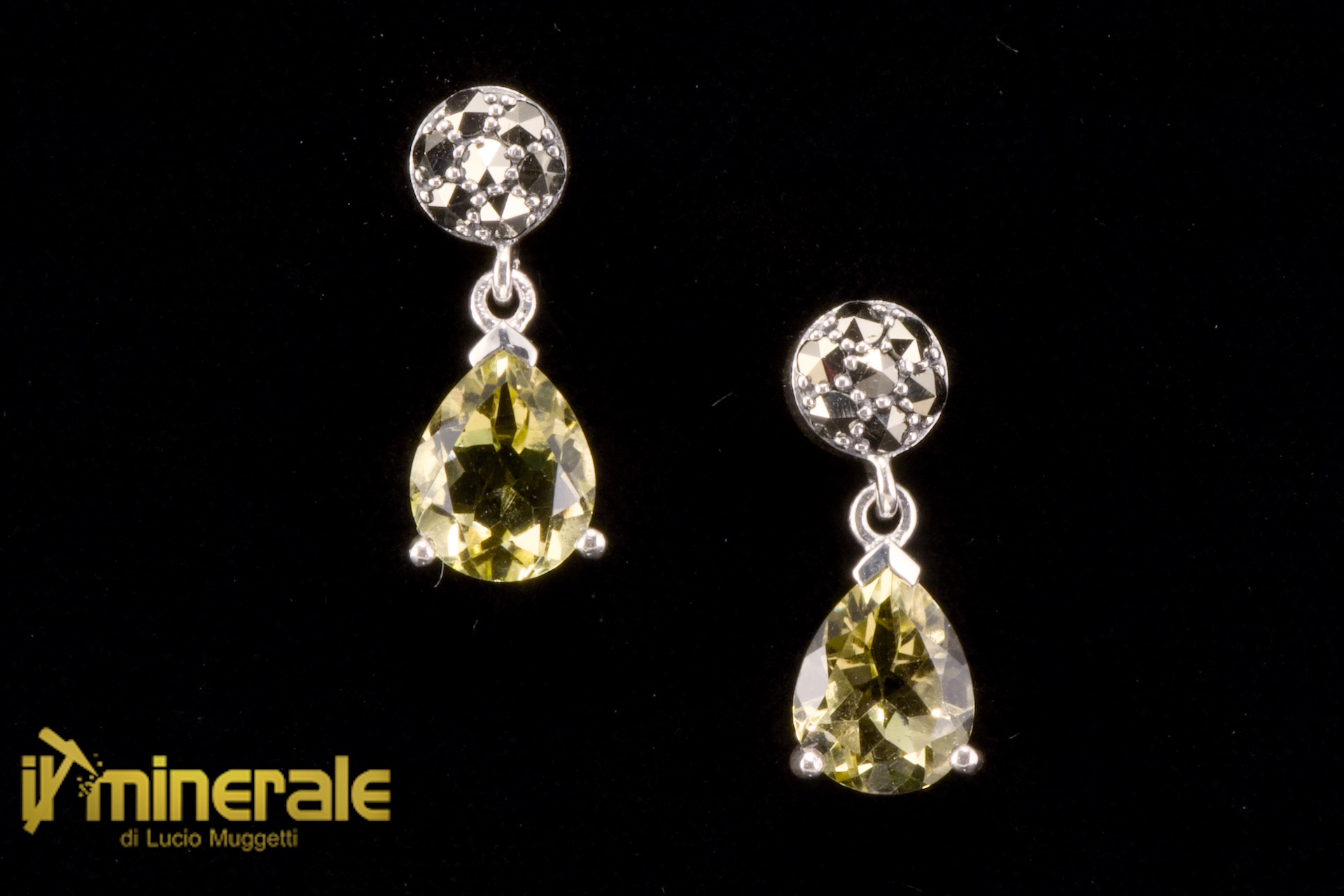 Orecchini a pressione pendenti in argento 925 con gocce di quarzo citrino lemon e marcassiti