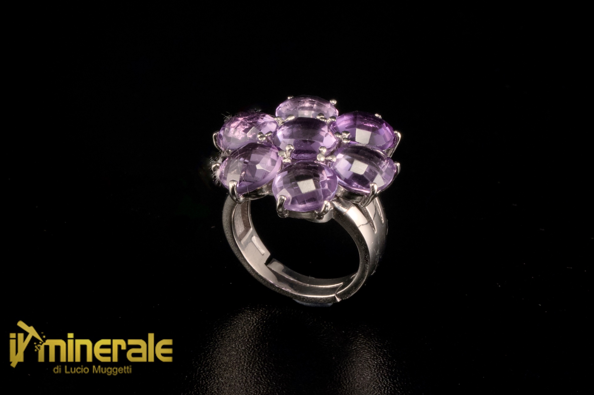 Anello in argento 925 rodiato con fiore composto da 7 briolette di ametista