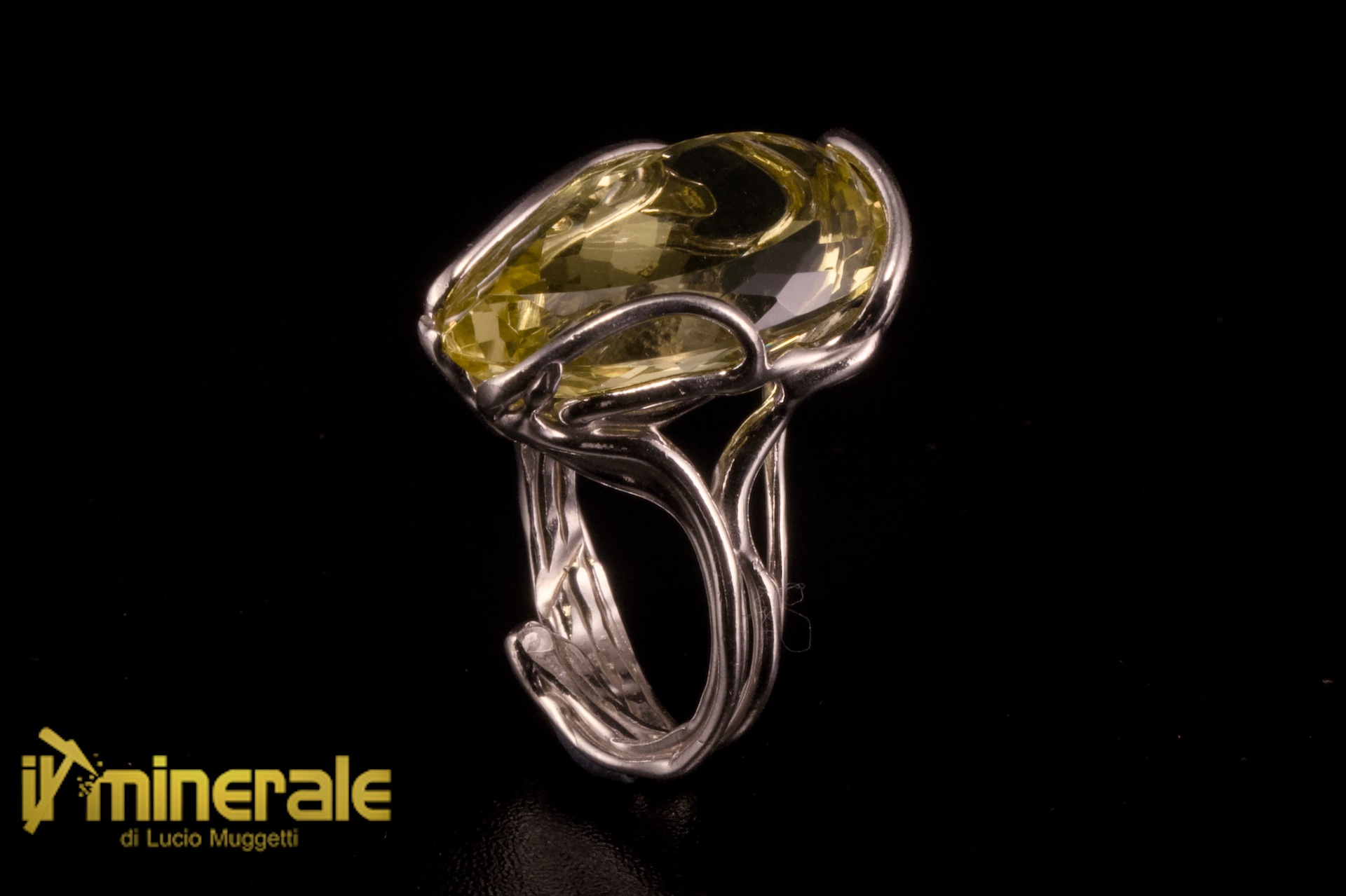 Anello in argento 925 rodiato con goccia sfaccettata di quarzo citrino lemon della dimensiopne di 25x15 mm